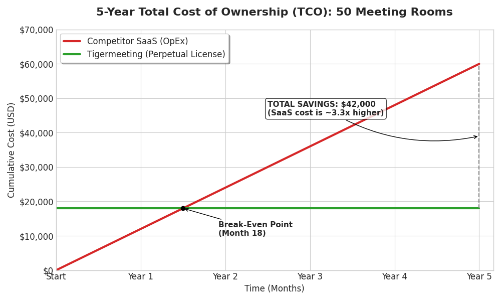 Years 3-5: The divergence becomes extreme. Every month, the SaaS solution effectively taxes the organization an additional $1,000 (for 50 rooms), while the Tigermeeting cost curve remains flat at zero.